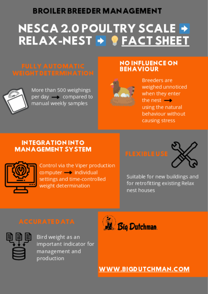 Big Dutchman introduces Nesca 2.0, a currently unique solution for broiler breeder managers: the nest-integrated scale determines the females’ weight automatically, every time they visit the nest to lay eggs. Touching or interrupting the hens is not necessary. The result: an extensive data overview and weight determination without stress for both humans and birds. Big Dutchman developed Nesca 2.0 specifically for the Relax nest.